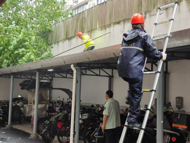 各区房屋维修应急中心也早早按要求做好相关的防汛防台的准备工作,包括相关人员的日常训练,防汛防台物资的准备。今年5月底前,各区房屋维修应急中心已全面完成小区排水管道疏通。徐汇区除了提前疏通排水管道,还对屋顶天沟进行了清理。