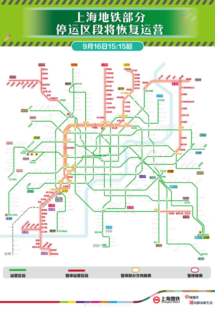 地铁最新消息:16号线、17号线全线逐步恢复运营,最新运行情况→ 崔逸星 2024-9-16 来源:周到上海 据上海地铁官方微博最新公告,根据市气象部门对台风预测的初步研判,目前,台风“贝碧嘉”风雨影响逐渐减弱,17号线全线15时起逐步恢复运营,16号线全线15时15分起逐步恢复运营。 需要提醒的是,受后续风雨影响,为确保运营安全,上述停运段恢复运营期间,部分区段可能会采取限速措施,行车间隔较大,请乘客注意。 另外,1号线、4号线、6号线、10号线、11号线高架地面区段及3号线、5号线全线,目前不具备运营条件,仍暂停运营。 来源:周到上海 作者:崔逸星 赞一个 (0)