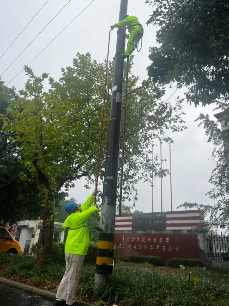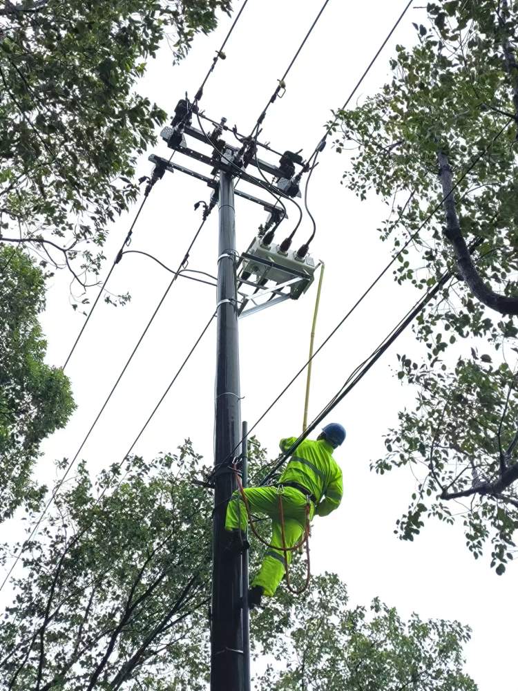 ■9月16日中午,松江狂风暴雨间歇,操作班班员吴斌在九亭镇九泾公路路,冒雨登杆,对一电杆的柱上开关进行操作,及时转移用电负荷,恢复周边停电区域供电