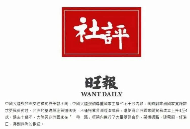 台湾《旺报》社评指出,过去十几年,大陆与非洲国家在“一带一路”框架内进行了大量基建合作,架桥通路、建电厂、修港口,得到非洲的欢迎。