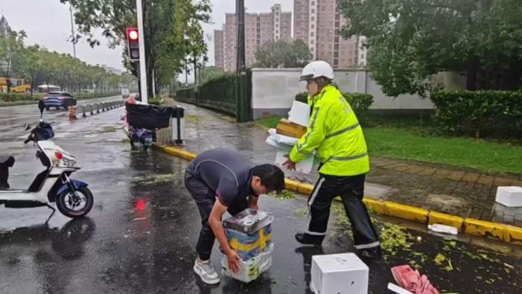 上午8时40分许,台风登陆后不久,浦东公安分局交警支队五大队中队长胡秋淳在沪南公路成山路巡逻时,发现一名顺丰骑手小哥在骑行过程中因遭遇短时强风不慎摔倒。