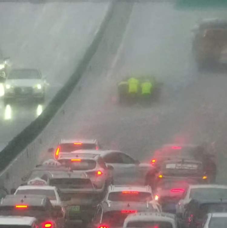 今天中午11时40分许,暴雨如注。浦东交警支队二大队通过视频巡逻发现,内环内圈北向南方向过锦绣路出口处,有一辆小客车抛锚在桥面积水处,并造成后续车辆无法通行。
