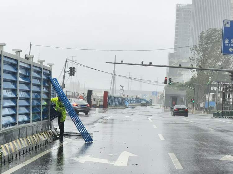 在这场抗击台风的战斗中,险情时有发生。上午9时30分许,浦东交警支队三大队民警陈思源和尹天宇在前往一处信号灯故障路口运送发电机途中,发现金科路新金桥路交叉口北面路中的施工工地围挡损坏,散落的材料影响了一根机动车道的通行。为了保障市民的安全,两位民警立即上前处理。