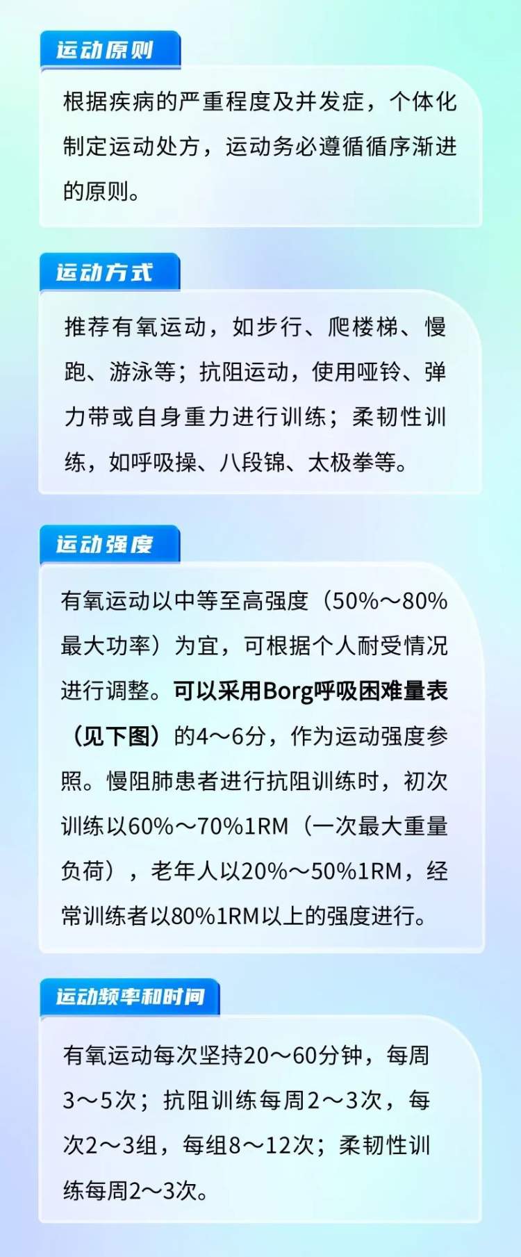@慢阻肺患者:请收下这份运动处方 | 运动是良医 2024-9-16 来源:健康中国 当前,我国慢性病防治形势复杂,55~64岁人群慢性病的患病率达到48.4%,65岁及以上老年人的患病率达62.3%。“运动是良医”理念将运动疗法与药物治疗有机结合,不仅能更有效地管理疾病,还能显著提高患者的生活质量。 慢阻肺患者在居家训练前,需要在医院进行完整的病史采集、体格检查和功能评估,根据检查结果与医务人员共同制订最佳管理方案。 患者在训练前需评估是否存在心血管和肌肉骨骼系统的异常,在初始训练阶段需监测心电图、血压和血氧饱和度等,判断是否需要吸氧治疗。同时,要保证充足的热身和放松运动,避免过度训练。 赞一个 (0)
