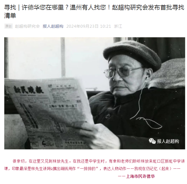9月23日上午,文成县赵超构研究会通过微信公众号“报人赵超构”发布了一则寻人启事,多位上海市民朋友也在朋友圈转发,助力寻找。这条寻人启事的内容主要是找一位日前到中国近现代新闻出版博物馆参观展览后留言的上海市民许德华。