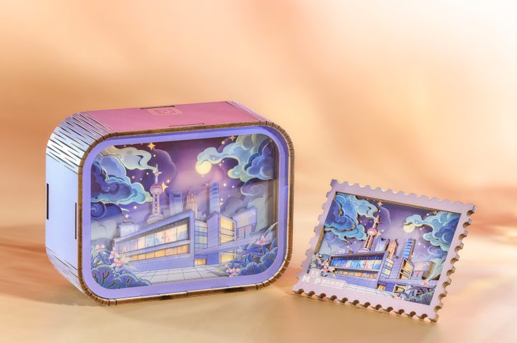 “我们设计了这款‘艺术建筑氛围灯’,展示出建筑特色及陆家嘴地区的景致,镜厅中也倒映着和对岸外滩建筑的百年风华,寓意这座城市的艺术之灯始终为市民点亮。根据这个图案,又设计出‘夜景立体冰箱贴’展示标志性镜厅的夜景。”浦东美术馆文化创意拓展部总监潘玥玲介绍道。