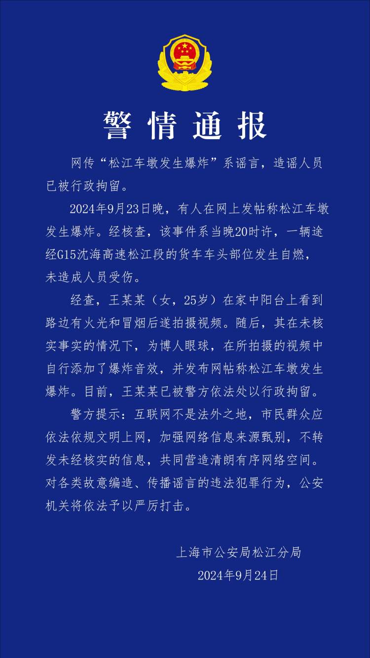 经查,王某某(女,25岁)在家中阳台上看到路边有火光和冒烟后遂拍摄视频。随后,其在未核实事实的情况下,为博人眼球,在所拍摄的视频中自行添加了爆炸音效,并发布网帖称松江车墩发生爆炸。目前,王某某已被警方依法处以行政拘留。