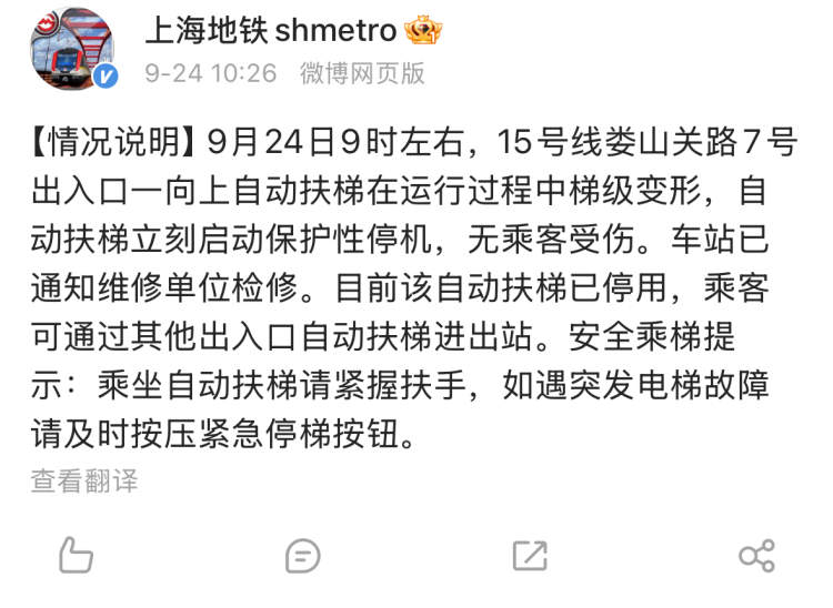 上午10点26分,上海地铁官方微博发布情况说明:9月24日9时左右,15号线娄山关路7号出入口一向上自动扶梯在运行过程中梯级变形,自动扶梯立刻启动保护性停机,无乘客受伤。车站已通知维修单位检修。目前该自动扶梯已停用,乘客可通过其他出入口自动扶梯进出站。