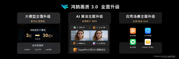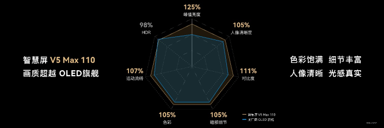 而华为史上最大尺寸的华为智慧屏 V5 Max 110,成为此次秋季新品价格仅次于汽车的品类。华为智慧屏 V5 Max 110的屏占比达到99%,边框仅有1.2mm,屏幕面积比98英寸足足大了 26.4%。该产品配备Super MiniLED屏幕——华为黑钻屏,其采用黑钻聚能SuperMiniLED、多晶量子点膜、黑钻超维场液晶技术、黑钻全景臻彩液晶补偿、纳米复合低反膜等技术手段,使显示屏拥有了高亮度、高色域、高对比、广视角、超低反射五大核心优势。