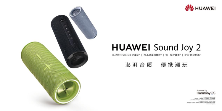 秋季全场景新品发布会发布的华为Sound 系列最新产品——HUAWEI Sound Joy 2,在音质、续航、智慧三大“硬实力”方面着重发力,该产品搭载了华为自研的HUAWEI SOUND四单元二分频声学架构,中低频震撼、高频嘹亮,单个音箱最大声量能覆盖一整个篮球场;续航方面,新品配备8800mAh大容量电池,支持40W快充,充电十分钟即可播放音乐一小时,在蓝牙连接下至高实现26小时的超长续航。