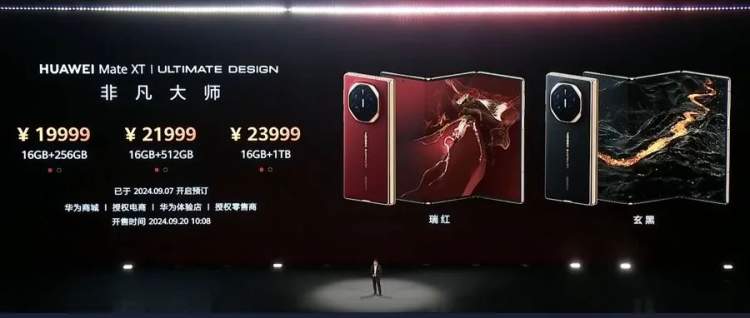 9月10日在深圳的华为非凡品牌盛典,发布三折叠屏手机——HUAWEI Mate XT 非凡大师,售价19999元起。