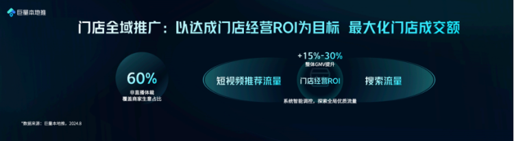 针对非直播体裁场景,平台还全新推出门店全域推广,它以达成门店经营ROI为目标,探索视频推荐流和搜索场景下的全局优质流量,从而达到门店成交额最大化。