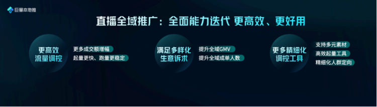 除技术优势外,今年全域推广在产品功能上也完成了新的迭代与突破。首先在直播场景下,全域推广进行了三个方向的升级: