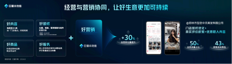 商家可以通过门店和商品沉淀订单与口碑,通过在线运营丰富商品、配置完备留资链路和组件、提升客服响应速度、积累用户真实好评等经营动作,结合巨量本地推做好营销投广,撬动更多的商业流量与自然流量。经营与营销的协同发力与正向滚动,能够帮助线索商家快速扩大生意规模,让好生意更可持续。