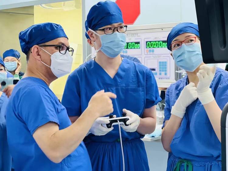手术当日,麻醉科主任李金波团队的邹云副主任医师负责为手术保驾护航。胸外科杨富副主任医师在范江教授及Raed Alnajja教授的指导下,操作支气管镜机器人进行定位。在全程可视的辅助下,穿刺针按术前规划的路径经过层级支气管,抵达肺部病变,并注入染料完成精准定位。随后,手术团队经单孔胸腔镜为患者完成了亚肺叶切除手术。