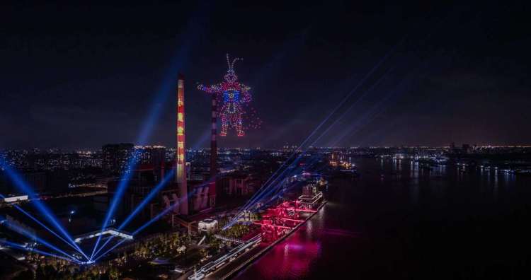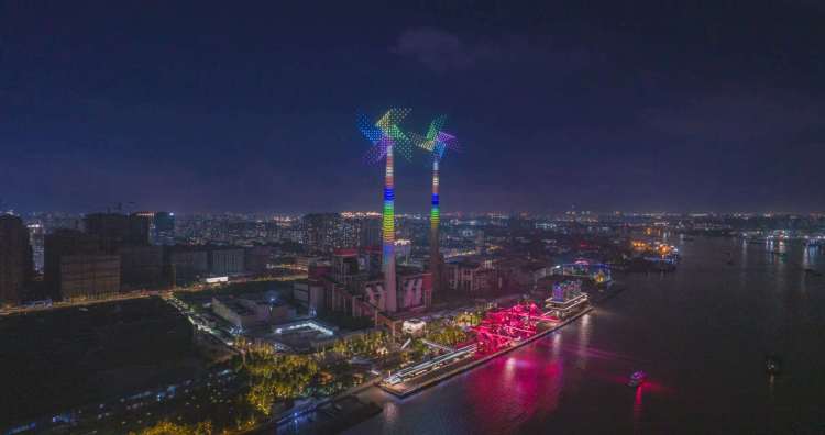 今晚,当首届上海国际光影节杨浦分会场正式启动后,无人机编队升空,变幻出“人民城市人民建”、“YOUNG”、大树等字样和图案。与此同时,古老的杨树浦电厂烟囱也变身可爱的长颈鹿和《西游记》中的经典场景,光影变幻的夜空仿佛拥有了无穷的生命力。