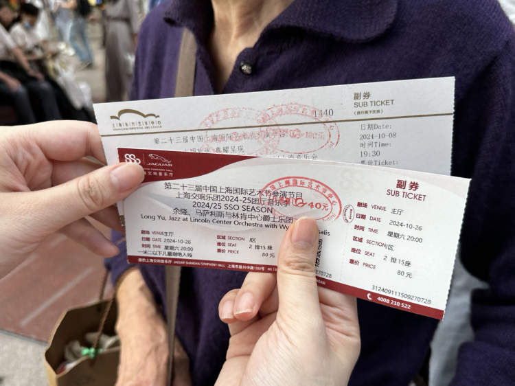 和蒋先生一样是艺术节资深观众的还有年过七旬的陈阿姨。“我看艺术节的演出也有十年了!”陈阿姨早上六七点就出发来现场,目标也很明确,都是自己心心念念的交响音乐会。“我喜欢听交响乐,一进音乐厅就感觉身心得到了放松,这比买什么保健品都管用。”排队第17个,陈阿姨的运气不错,收获了王羽佳和余隆的两场热门演出门票。