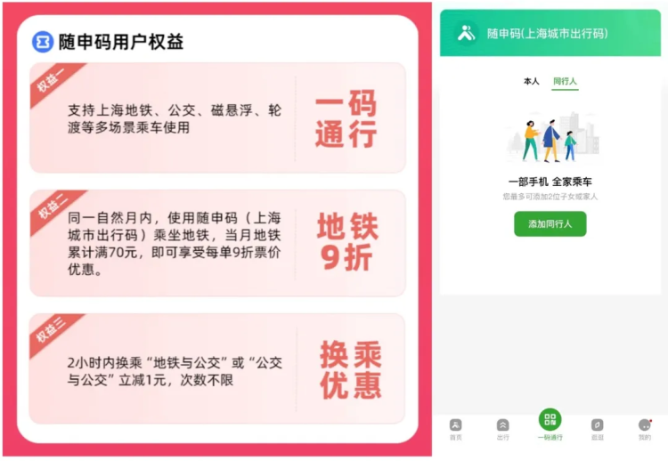 2.一部手机可至多添加2名“同行人”共同乘车,方便让老人、小孩等不便使用手机的同行乘客依次刷码,假期首笔同行人订单还有5折优惠。(详见“随申行周年庆”活动)