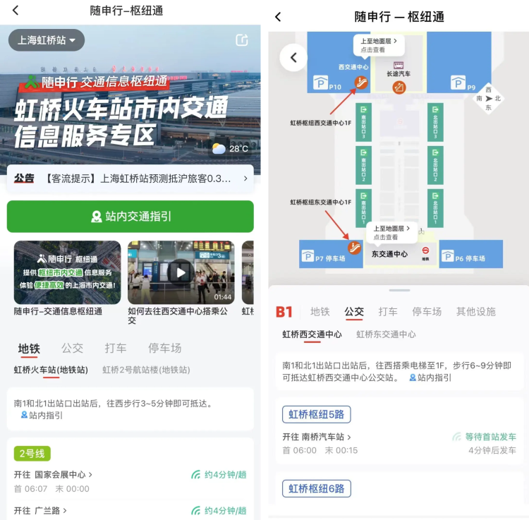 在“随申行”APP或微信小程序内,点击“枢纽通”专区,系统将根据用户的当前位置自动推荐就近的枢纽场站,上海“两场三站”都支持切换查询.