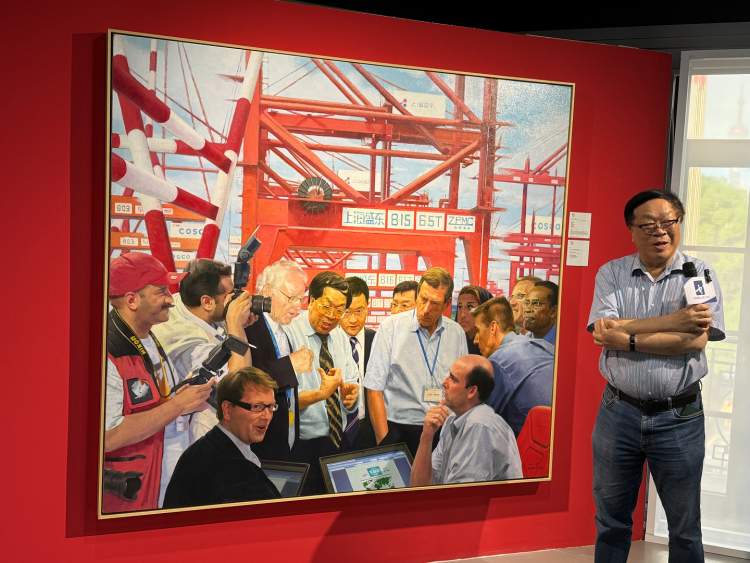 大约15年前,彼时还在上港集团工作的包起帆为了让中国发明变成世界标准,将众多“老外”请来了上海,最终促成了我国在物流和交通运输领域首个国际标准的发布。而他向各位“老外”们讲解中国技术的历史照片被艺术家改编成油画,并展出于上海市工人文化宫。