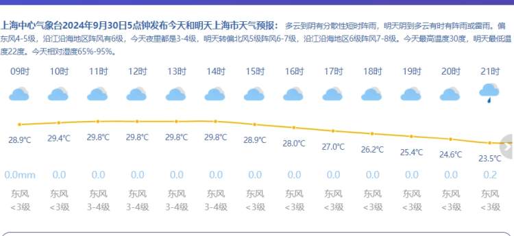 国庆假期前的最后一个工作日,申城今日天气多云到阴为主,有分散性短时阵雨。气温跟昨天相仿,全天保持在25~30℃之间,偏东风4~5级,沿江沿海地区阵风有6级,夜里都是3~4级。今天相对湿度95%~65%。