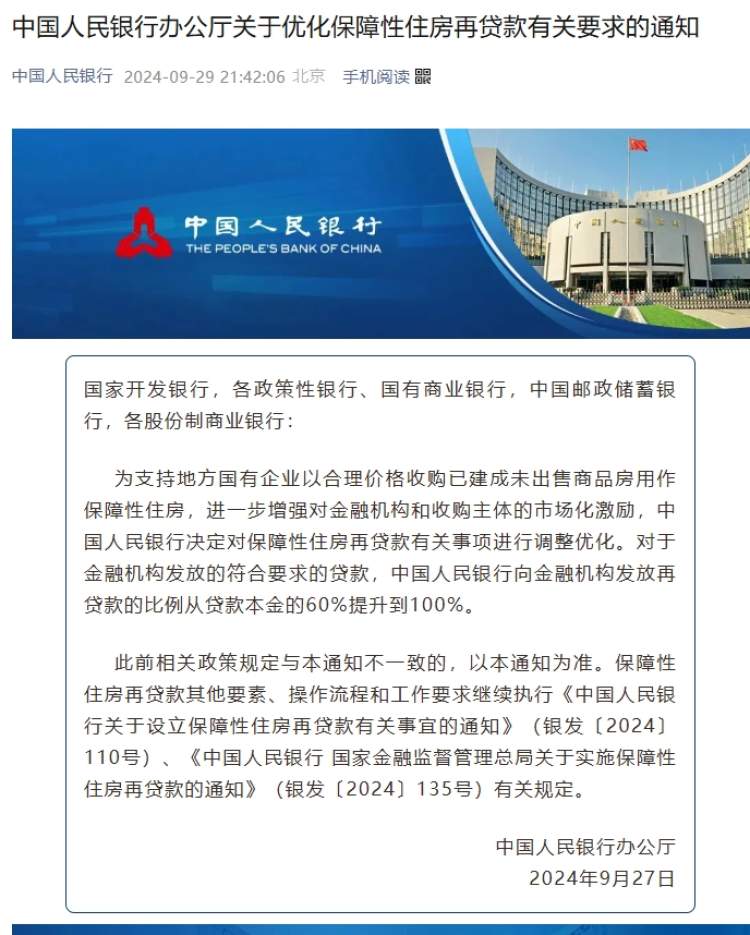为支持地方国有企业以合理价格收购已建成未出售商品房用作保障性住房,进一步增强对金融机构和收购主体的市场化激励,中国人民银行决定对保障性住房再贷款有关事项进行调整优化。对于金融机构发放的符合要求的贷款,中国人民银行向金融机构发放再贷款的比例从贷款本金的60%提升到100%。