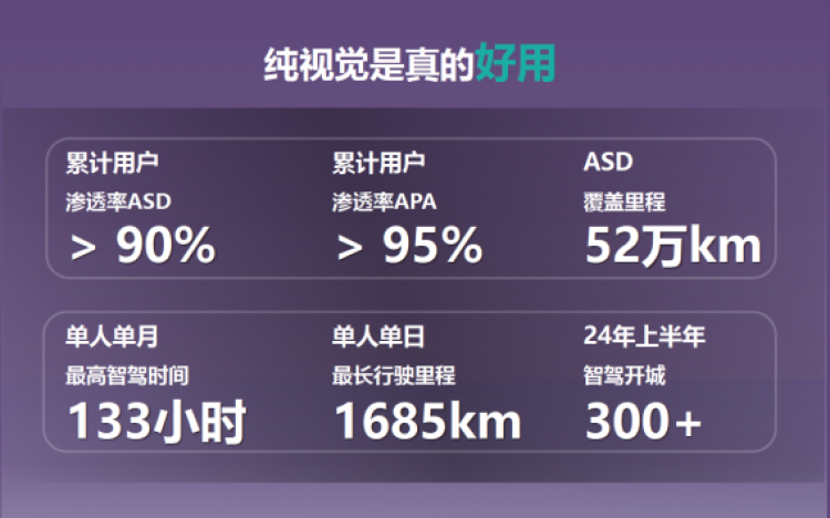 作为百度和吉利控股集团联合打造的高端智能汽车机器人品牌,极越代表着前瞻的AI大模型技术与高水平汽车智造的融合创新。极越旗下车型极越01、极越07已经全面搭载ASD(Apollo Self Driving)阿波罗高阶智能驾驶,正式进入纯视觉端到端大模型阶段,这也是L4自动驾驶大模型技术首次赋能家用车。从极越内部用户数据来看,ASD渗透率超过90%,单人单月最高智驾时间达133小时、单人单日最长行驶里程1685km。可见,用户对极越ASD高阶智驾尤为喜爱。