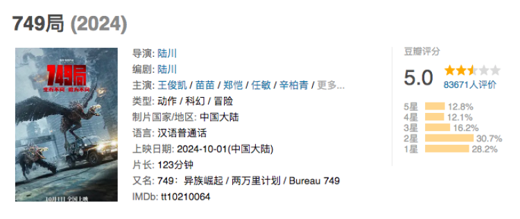 目前,《749局》豆瓣也已开分,评分为5.0分,而陆川上一部同类型电影《九层妖塔》豆瓣评分为4.4分。