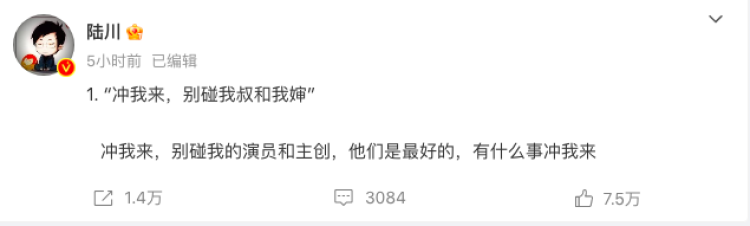 针对这些争议,陆川在今天连发三条微博回应。他先引用片中王俊凯的台词“冲我来,别碰我叔和我婶”,直言“冲我来,别碰我的演员和主创,他们是最好的,有什么事冲我来。”