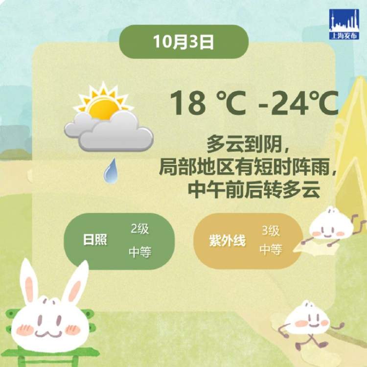 今天上海多云到阴局部地区有短时阵雨,中午前后转多云,偏北风4-5级阵风6级,沿江沿海地区5-6级阵风7级,全天气温在18℃-24℃之间,白天体感总体较舒适。