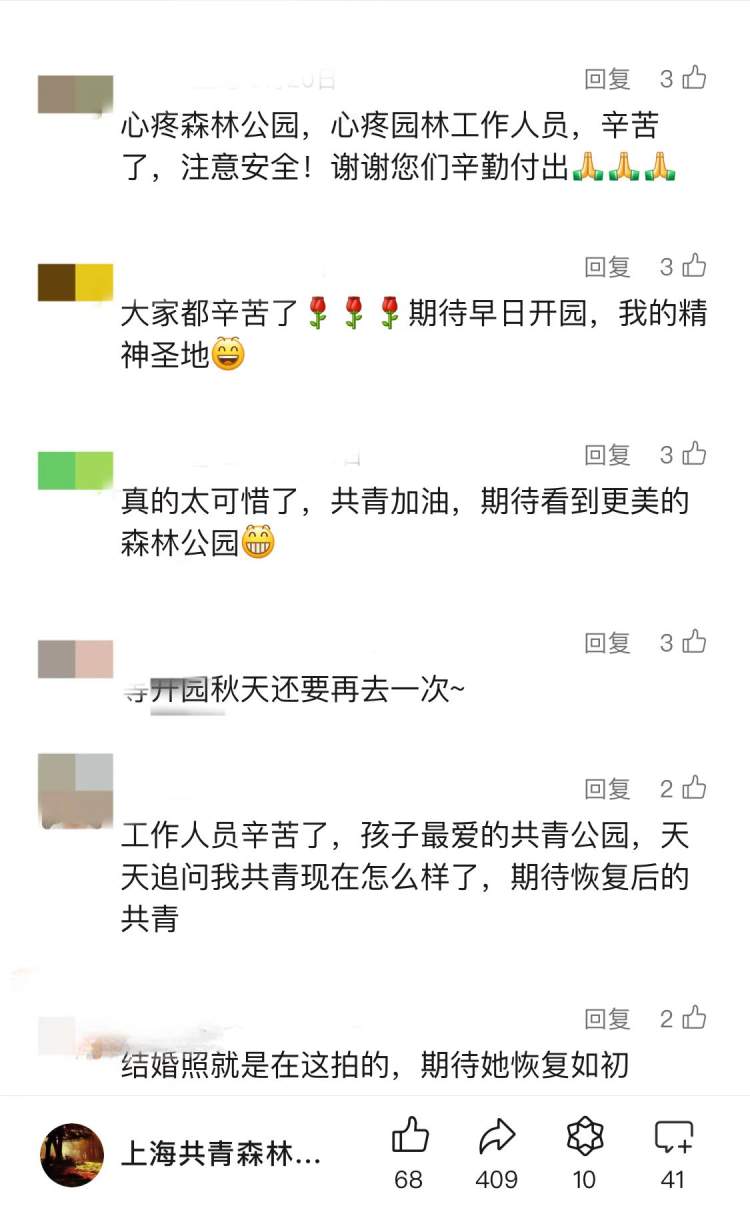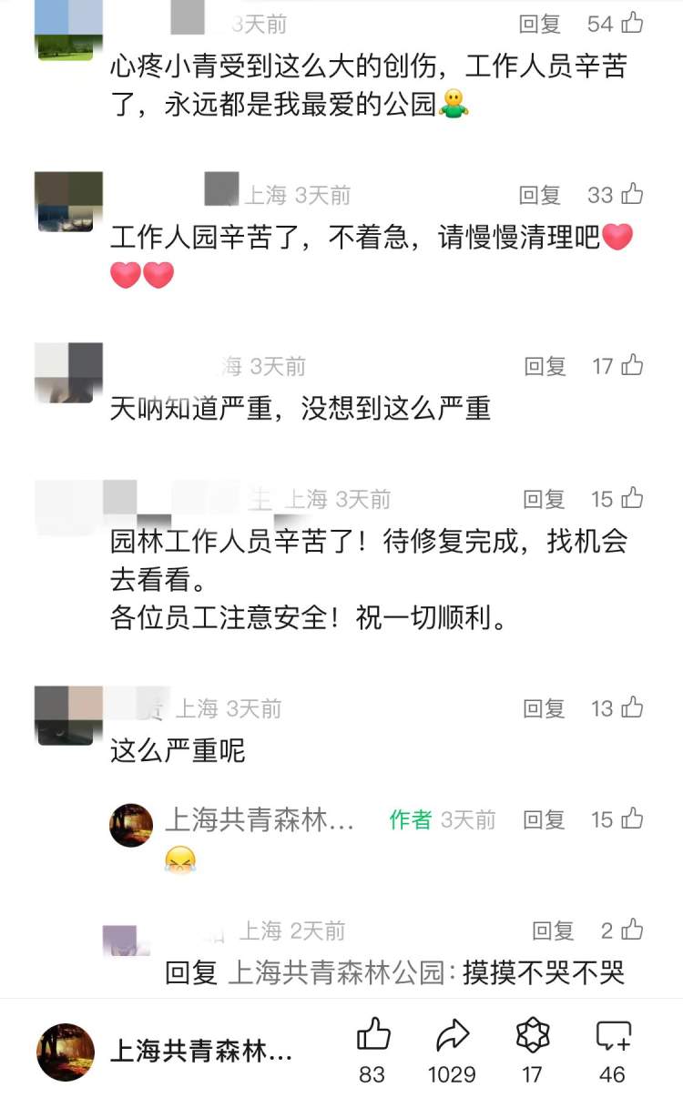 市民游客纷纷在公园微信公众号留言,表达对“小青”遭到台风重创的痛心和对工作人员奋力恢复开园所付出的辛苦的敬意。