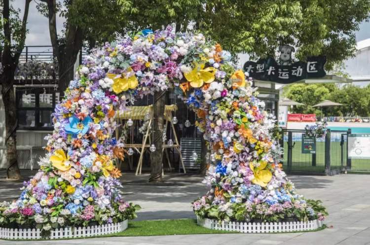 布置这些鲜花绿植的上海源彩绿化公司相关负责人介绍,国庆假期来临,人需要喜庆的氛围,其实狗狗们也喜欢漂亮的环境,创造一个花团锦簇的氛围也是对狗狗们的关爱和尊重。