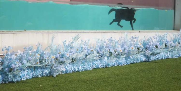 在大型犬运动区检票口,有鲜花组成的拱门,上面挂着晶莹的灯球。大型犬运动区内的瀑布花墙更惊艳,泳池边也布置了蓝色氛围花。中小型犬运动区和漫步区同样鲜花绿植环绕,让人和狗都仿若置身童话世界。