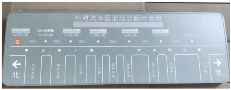 目前,外滩总长1.5公里的亲水平台沿线,每隔300米左右,就有一座固定公厕,节假日期间还增设了临时移动厕所。手机上的小程序和H5页面可以查询厕所地址,还有随处可见的公厕蓝色指引路牌,让游客在游览的时候,也能轻松“方便”。