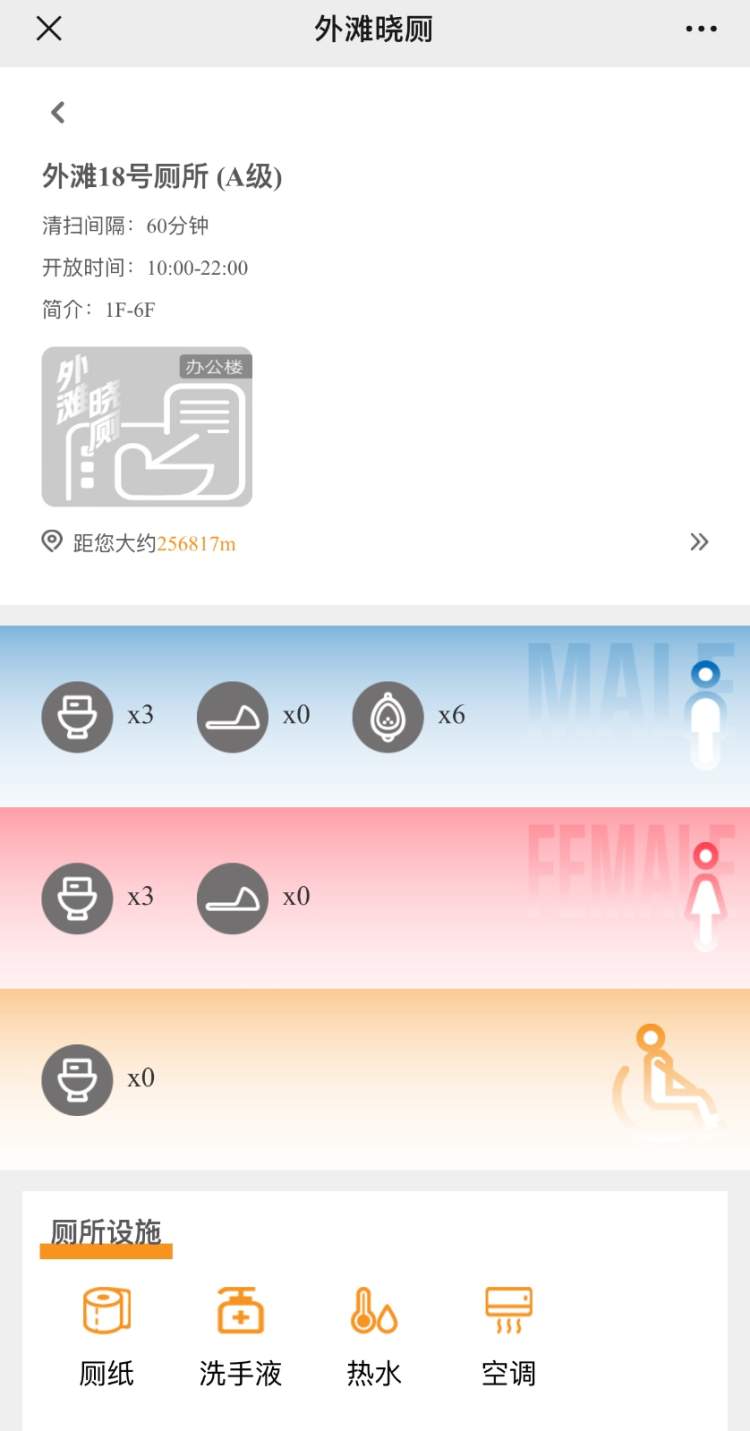 扫码进入“外滩晓厕”页面,可以看到外滩区域公共厕所、移动公厕和商场、餐饮等对外开放厕所的位置信息,还可以导航指引。寻厕步行时间、如厕等候时间等信息也将逐步完善。