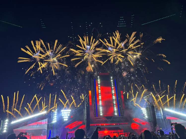 演出临近尾声,一场美丽的烟花秀将整个电音节推向了高潮,与舞台交相辉映的烟花不仅在夜空中绽放,也永远留在了王心诺、范祎龙等电音爱好者的回忆里。