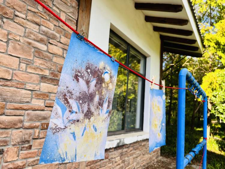 10月4日下午我来到宝山社区美术馆,看到美术馆内流动馆长周海霞正在为观众讲解“野趣生活”展览中的精美插画作品。在美术馆的一个布置得颇具艺术氛围的房间内,艺术家倪卫华和“边跑边艺术小组”正在忙碌地实验一项新的工作坊项目——湿蓝晒技术。他们的专注神情和实验材料,为这个空间增添了几分科学实验室的神秘感。