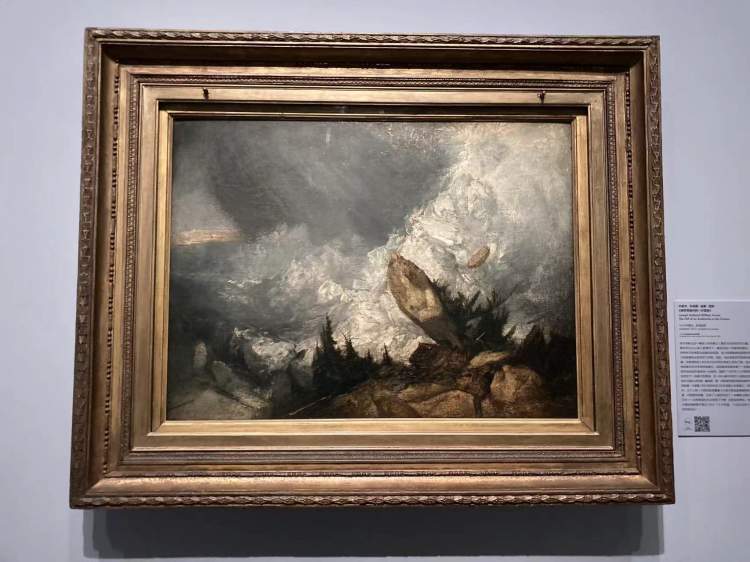 他曾画过一幅著名的油画《格劳宾登州的一次雪崩》,这次也来到了浦东美术馆展出。虽然没有记载能表明透纳曾亲眼目睹了这次雪崩,但雪崩的场景之惊人,在透纳的画作中被表现得淋漓尽致,尤其那块从山坡上直落而下摧毁了木结构建筑的巨石,简直是神来之物。