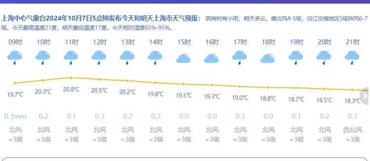 今天是国庆长假的最后一天,阳光难觅,阴雨相伴,大家回程路上要注意交通安全。具体预报:阴有时有小雨,18~21℃,偏北风4~5级,沿江沿海地区5级阵风6-7级,相对湿度95%~65%。风力较大,湿度较高,体感有些阴冷,建议加件外套。