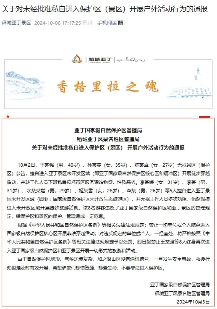 10月2日,王某强(男,40岁)、孙某英(女,35岁)、陈某卓(女,27岁)无视景区(保护区)公告,擅自进入亚丁景区未开发区域(即亚丁国家级自然保护区核心区和缓冲区)开展徒步穿越活动,并趁工作人员下班私自损坏景区服务驿站物资,性质恶劣。李某婷(女,31岁)、李某(男,31岁)、吹某某增(男,29岁)、姬某雪(女,26岁)、李某(男,26岁)等5人擅自进入亚丁景区未开发区域(即亚丁国家级自然保护区未开放生态旅游区),并无视工作人员多次劝阻,仍然偷摸进入未开放区域开展徒步旅游活动。该8名游客违反了亚丁国家级自然保护区和亚丁景区的管理规定,给保护区和景区的保护、管理造成一定危害。