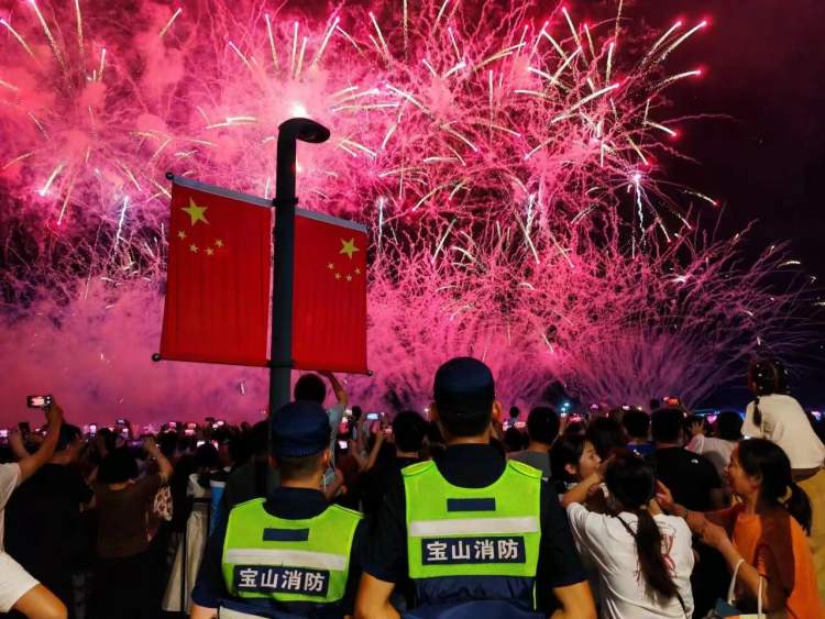 国庆期间,宝山区推出“海上繁花”国庆空中剧场秀,无人机和烟花表演联袂登场,点亮滨江夜空。为做好现场消防安全工作,宝山消防派出7个驻防团队,定时做好大型场所的消防巡逻巡查任务,全力护航“海上繁花”。