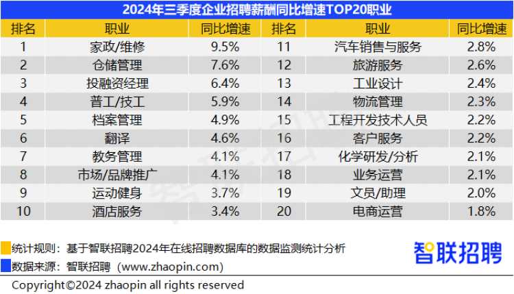2024年第三季度,智联招聘发布的《中国企业招聘薪酬报告》中展示了国内38个核心城市企业的招聘薪酬水平,除此之外还分析了重点行业、重点职业的招聘薪酬变化,如受消费需求回暖影响,文旅行业和服务型岗位招聘薪资有所提升。