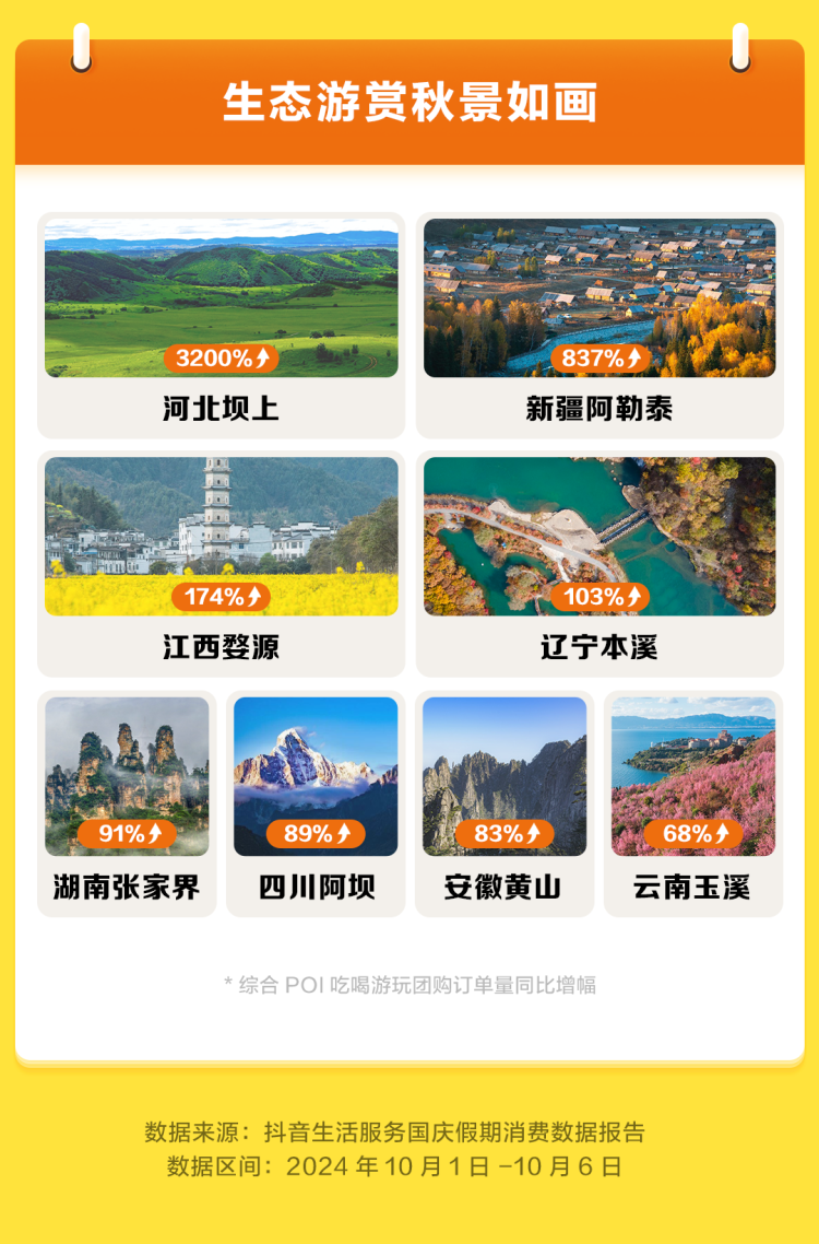 河北坝上草原入选国家林草局、文旅部联合推荐的特色生态旅游线路,当地吃喝游玩相关抖音团购量在假期同比增长3200%。秋色已深的新疆阿勒泰、村落晒秋文化传承的江西婺源、群山绵延层林尽染的辽宁本溪相关吃喝游玩团购订单量分别同比增长了837%、174%和103%。同时,湖南张家界、四川阿坝、安徽黄山、云南玉溪等地也迎来了赏秋潮,相关吃喝游玩团购量明显增长。