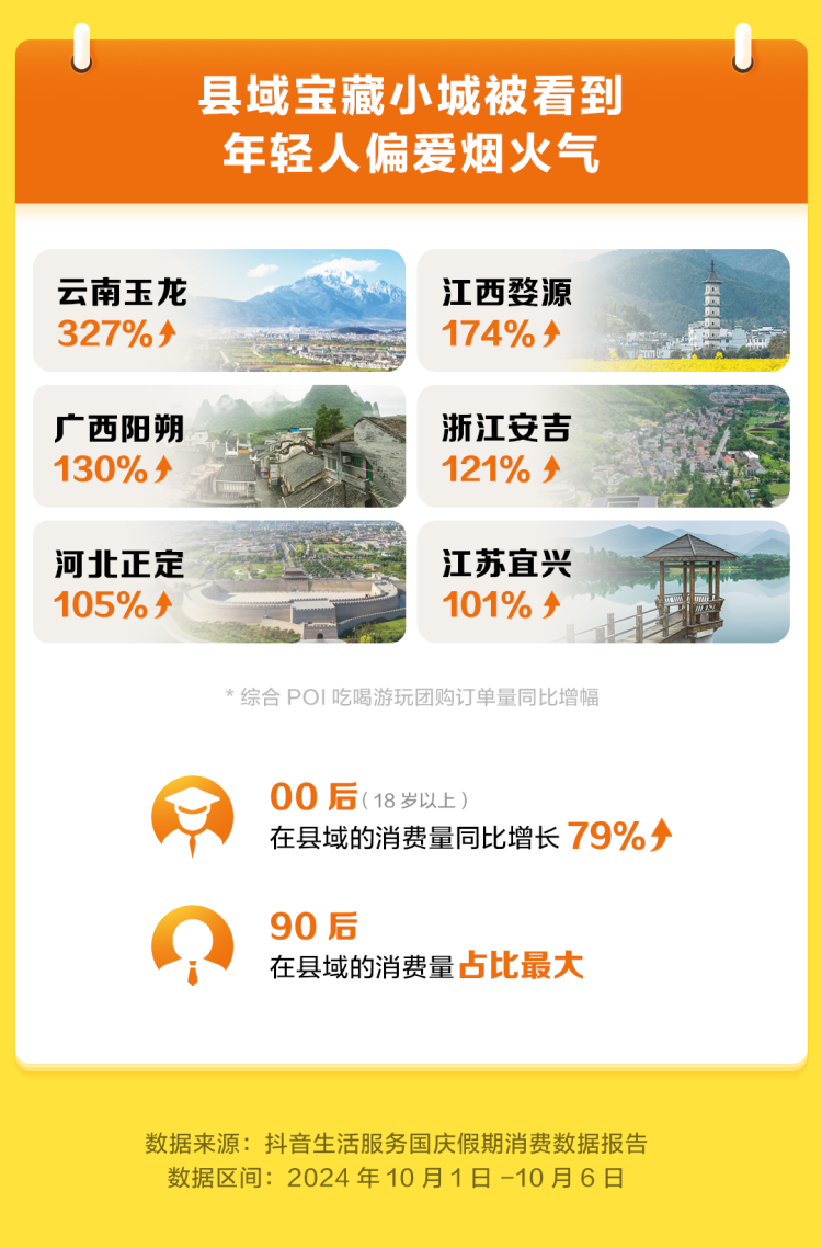 今年国庆假期,一部分年轻人选择继续“奔县”,偏爱小城里的烟火气。抖音生活服务数据显示,10月1日至6日,云南玉龙在抖音的相关团购订单量同比增长327%,江西婺源、广西阳朔、浙江安吉、河北正定、江苏宜兴等特色县域吃喝游玩团购订单量达到去年的2倍以上。