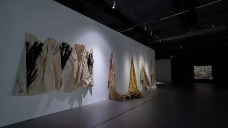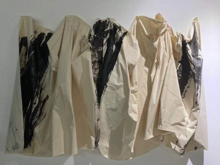 边平山的作品《隐匿的数字系列》,从外表看就是3块大尺幅的布料以不同形态垂挂在墙上,布料是艺术家9月28日才画完的。