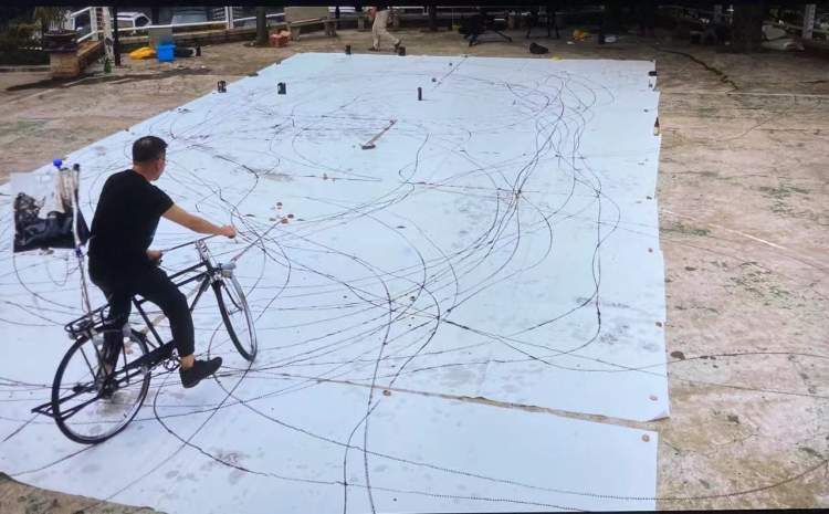 1985年,王璜生和朋友一起骑自行车追根溯源,从广州顺珠江一路骑行到了云南,历时3个月。这段经历对艺术家的成长非常重要。多年后,他用行为艺术的形式,改装了自行车,用吊盐水的袋子装满了墨汁,滴在轮胎上,在地面铺着的纸上,骑出了这一片线条,去记录他人生中重要的那3个月。