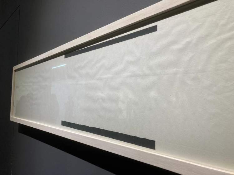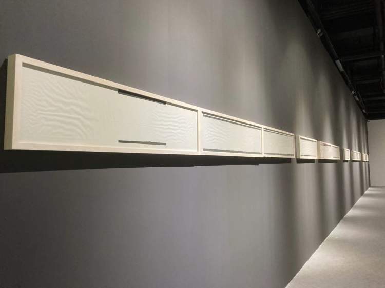 艺术家谭平的《一划-40》就是一长排画框,里面是非常单调的白色卡纸和边上的黑色线条。任小璐说,这是“一根被抛弃的线条”。