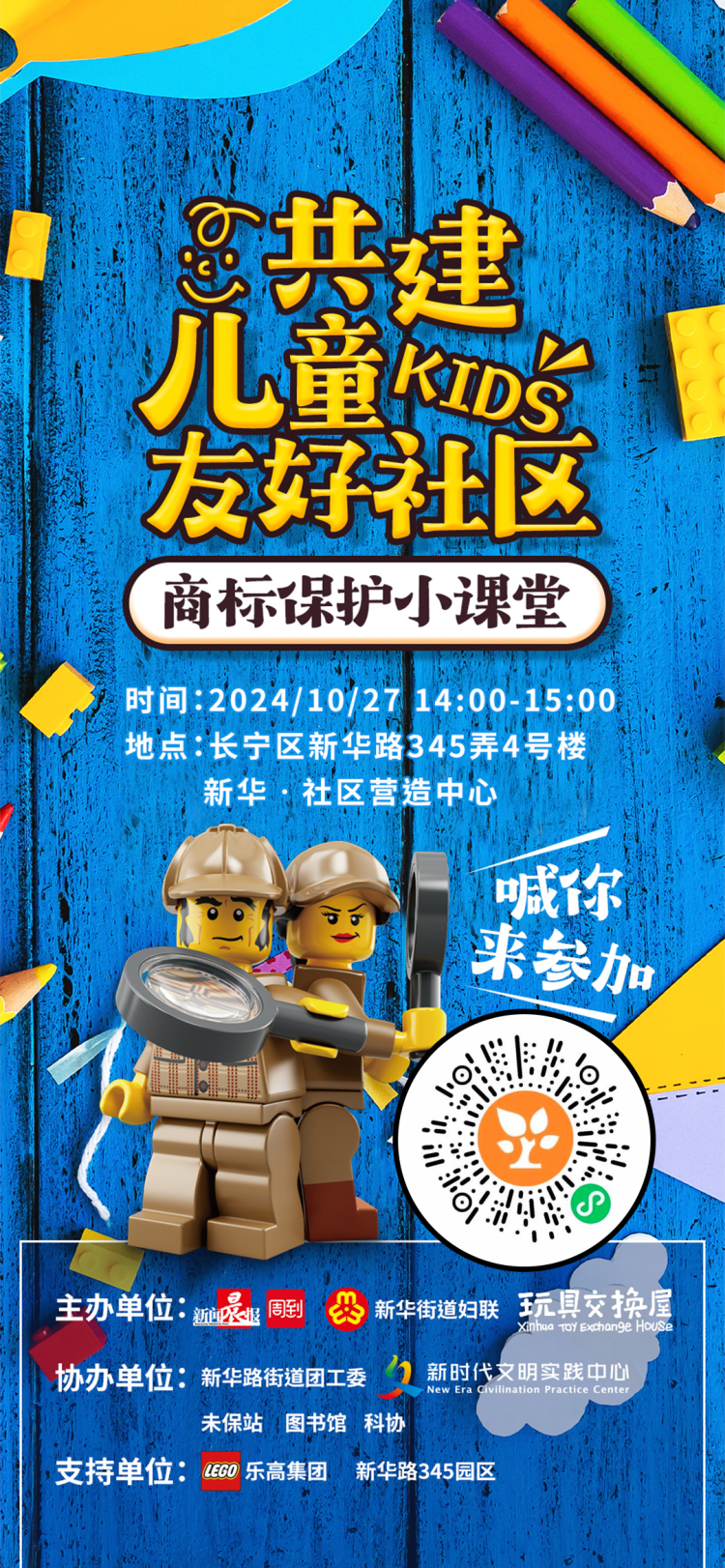 因此,儿童友好活动周期间,由新闻晨报、新华路街道妇联、新华玩具交换屋主办的,新华路街道团工委、新华路街道新时代文明实践分中心、新华路街道未保站、图书馆、科协协办,乐高集团、新华路345园区作为支持单位,一起在新华社区营造中心,来一场沉浸式的商标保护小课堂,get玩具商标小常识,在亲子游戏中迸发更多儿童友好的创意。