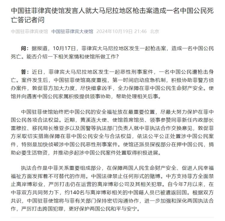 10月19日晚,据“中国驻菲律宾大使馆”微信公众号消息,中国驻菲律宾使馆发言人就大马尼拉地区枪击案造成一名中国公民死亡答记者问。