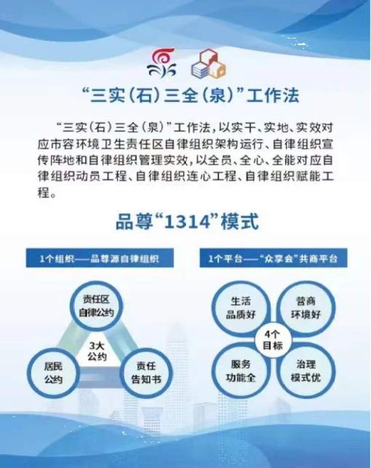 品尊源自律组织创新性地建立“三实(石)三全(泉)”工作法,将实干、实地、实效与市容环境卫生责任区的自律组织架构运行、宣传阵地建设以及管理实效紧密结合,旨在通过整合区域资源,形成“共建、共管、共治、共享”的治理模式。围绕这一治理模式,品尊源自律组织推行了全域门责制,在卫生整治、垃圾分类、资源共享等领域积极作为,有效促进了商户从“被动管理”向“自我管理”的转变,推动了区域环境管理从“他律”走向“自律”。